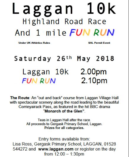 Teas in Laggan Hall after the race. All proceeds to Gergask Primary School, Laggan. Prizes for all categories.